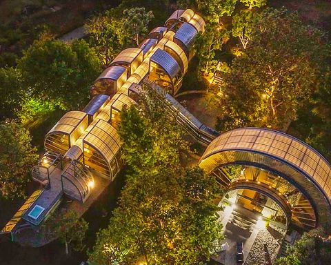 La estructura se estira en el terreno como una nave espacial alargada. Está elevada unos cinco metros sobre el suelo, apoyada con una delicadeza casi quirúrgica. No hay esa sensación de cimentación agresiva, de dominación del territorio. Más bien parece que el artefacto ha decidido posarse sobre la topografía, como si respetara su fragilidad.