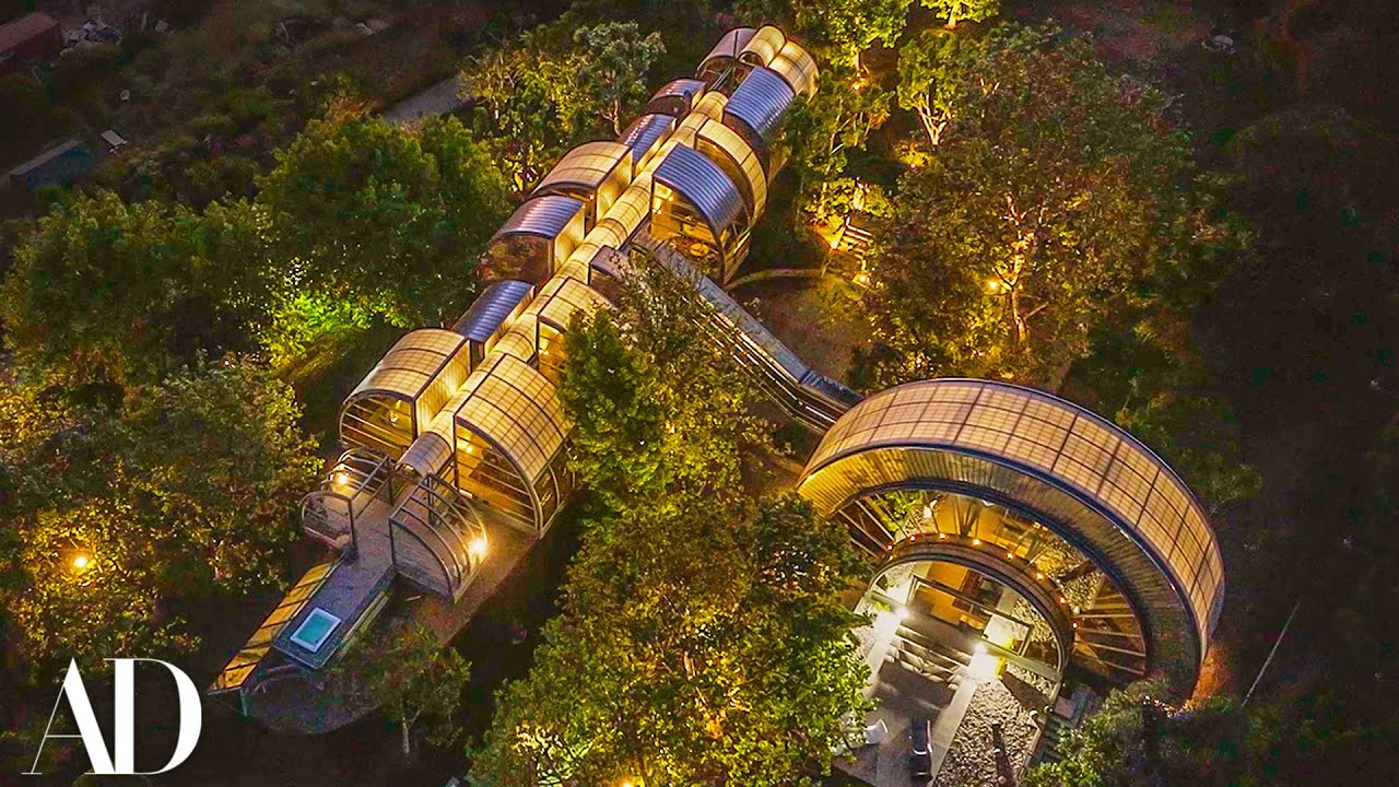 La casa de Niles funciona como un “render construido” de esa fantasía. Pods enganchados a una columna vertebral. Pasarelas suspendidas. Estructura elevada sobre un terreno escarpado.